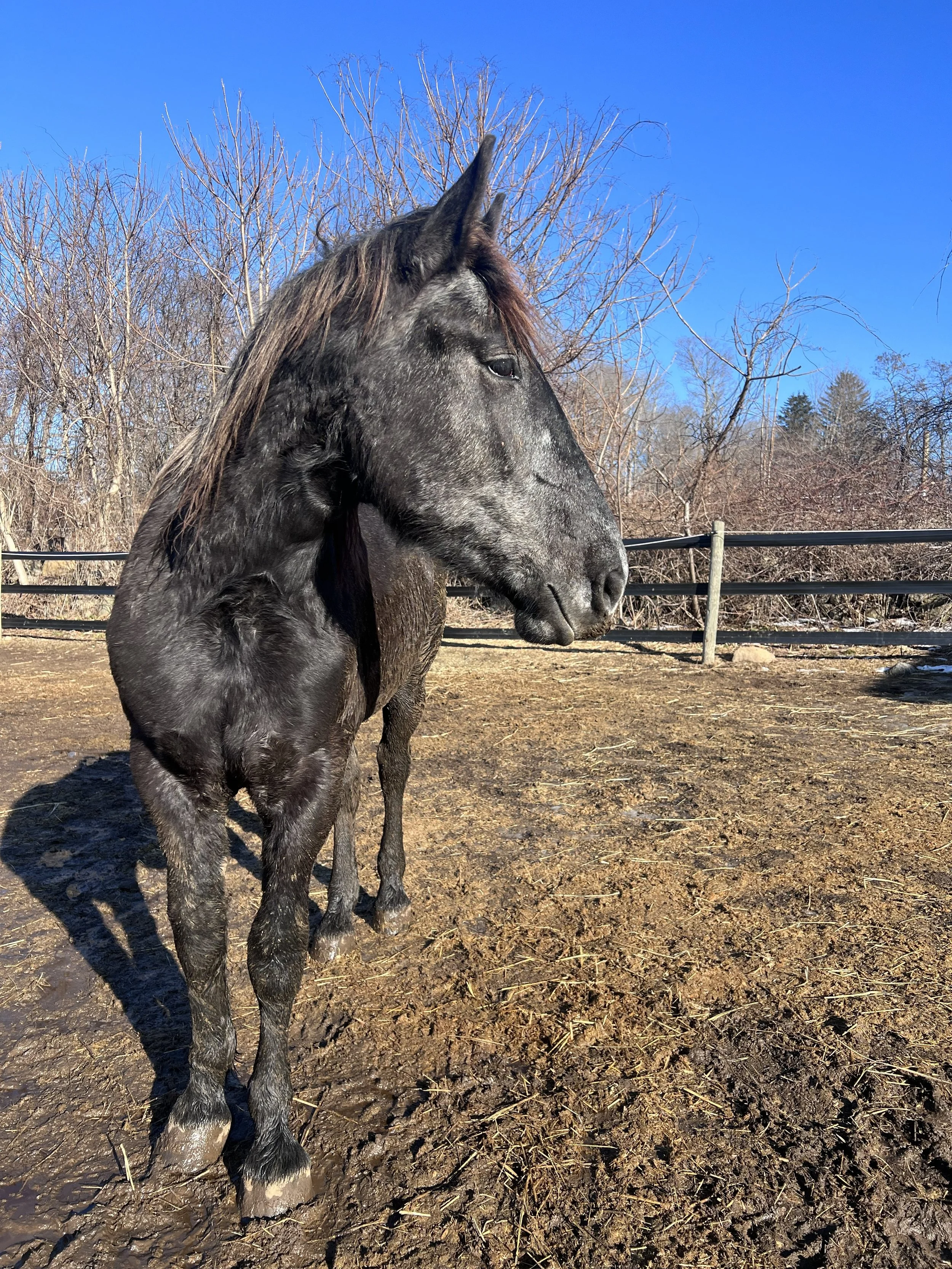 When he arrived he was very underweight, had neglected hooves and teeth, and has not yet been gelded. He will be gelded before he is adoptable.